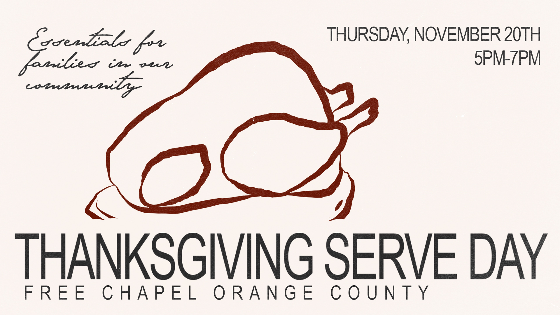 Come serve with us on Thursday, November 20th to partner with and bless hundreds of families in OC! We'll be working on partnership projects, assembling Thanksgiving Essential Kits, and distributing turkeys in our parking lot.